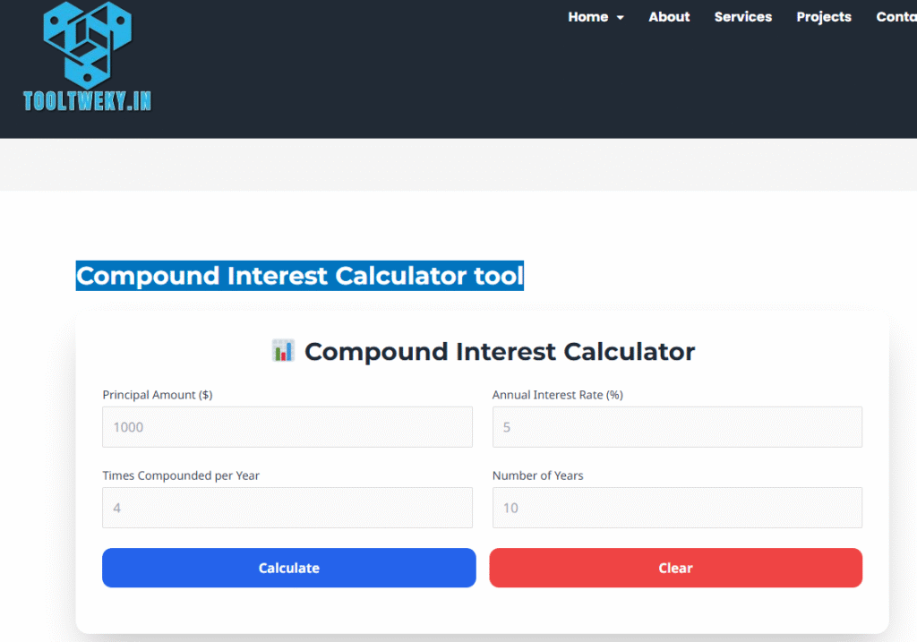 A Compound Interest Calculator Tool is an online tool that helps you calculate how your money grows over time when interest is added not only on the original amount but also on the accumulated interest. This is different from simple interest, where interest is calculated only on the principal amount. The Compound Interest Calculator is widely used for savings, fixed deposits, investments, and loans. It is easy to use and very helpful for students who want to understand how money multiplies with time.
